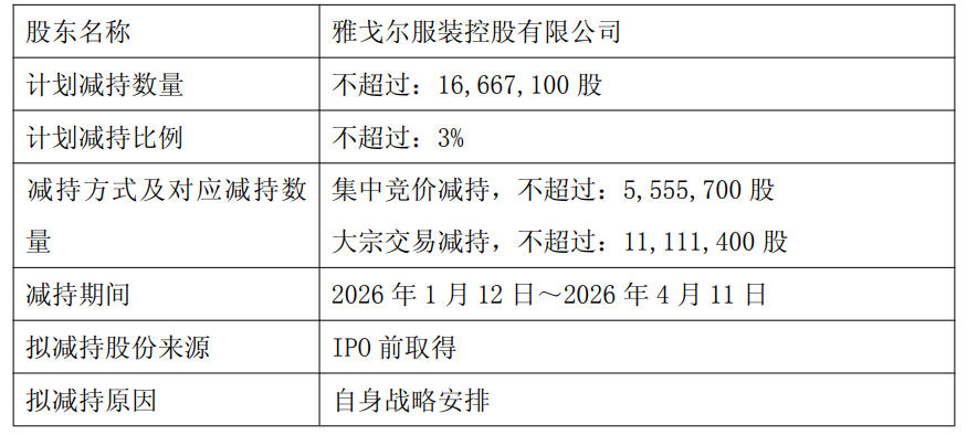 中国经济网北京12月18日电 盛泰集团(605138.SH)昨日晚间发布公告称,拟减持5%以上股东持股。公司持股5%以上股东雅戈尔服饰控股有限公司(以下简称“雅戈尔服饰”)持有公司无限售条件流通股70,079,155股,占公司总股本的12.61%。上述股份均来源于公司首次公开发行股票前持有的股份,将于2022年10月28日上市流通。 自减持计划公告起15个交易日后的3个月内,雅戈尔服饰拟减持不超过公司交易股份总额(公司竞购总金额)的1%。其他减持不超过5,555,700股;拟通过大宗交易减持不超过公司总股本2%减持股份,即减少股份数量不超过 11,111,400 股。若公司在拟减持期间发生送股、资本公积金转增股本、配股等除权事项,则减持股份数量将相应调整。新浪财经数据显示,雅戈尔服饰初始持有9926.15万股,占总股本的17.87%。雅戈尔服饰自2023年1月3日起首次减持盛泰集团,截至目前已减持公司股票2918.23万股,套现合计约2.21亿元。盛泰集团于2021年10月27日在上海证券交易所挂牌上市,发行数量5556万股,发行价格9.97元/股。保荐机构为中信证券股份有限公司,保荐代表人为欧阳浩迪、秦成东。该股票目前处于交易状态阿库特。盛泰集团首次公开发行股票募集资金总额5.54亿元,募集净额4.63亿元。盛泰集团2021年9月23日发布的招股书显示,公司拟募集资金4.63亿元,将用于纺织技术创新建设项目(嵊州)、纺织技术创新建设产能扩建项目(越南)、湖南新马服装有限公司生产线技术改造升级、盛泰集团生产线生产项目、盛泰集团织造服装生产中心建设项目升级改造建设项目及配套工作。资本。盛泰集团首次公开发行股票发行费用总额为9121.73万元,其中保荐、承销费用4808.68万元。盛泰集团将于2022年公开发行A股可转换公司债券。中国证监会关于同意浙江盛泰服装集团股份有限公司《关于公开发行可转换公司债券的批复》。 (证监许可[2022]2409号),经上海证券交易所许可,盛泰集团公开发行可转换公司债券7,011,8 00份,每张面值100元,募集资金总额701,180,000.00元。扣除不含税发行费用17,334,979.37元后,实际募集资金净额为683,845,020.63元。上述资金经融诚会计师事务所[2022]]200Z0075号《验资报告》验证已到位。经测算,盛泰集团2022年首次公开发行股票及公开发行A股可转换公司债券共募集资金12.55亿元。