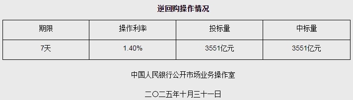 央行31日开展7天期逆回购操作3551亿元 2025-11-01 中国经济网版权所有 中国经济网新媒体矩阵 网络广播视听节目许可证(0107190)(京ICP040090) 公开市场业务交易公告[2025]210号 2025年10月31日,中国人民银行以固定利率和成交量竞价方式开展3551亿元7天期逆回购操作。具体情况如下: (编辑:单小兵)