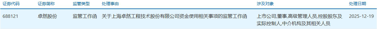 中国经济网北京12月23日讯 上海证券交易所网站12月19日发布了关于上海卓然工程技术股份有限公司(以下简称“卓然股份”,688121.SH)资金使用相关事项的监管工作函。涉及对象为上市公司董事、高级管理人员、控股股东及实际控制人、中介机构及相关人员。卓然12月19日晚间关于收到上海证监局行政监管措施决定书的公告显示,公司已收到《关于对上海卓然工程技术有限公司采取纠正措施并采取对张某、张某、吴通宇、上海金虹采取警告信措施的决定》。证监局2025年12月19日(沪证监发〔2025〕268号)。 2021年至2024年实施期间IPO募集资金项目中,公司违规缴纳部分募集资金,并通过公司控股股东、董事长张金红实际控制的供应商或资金渠道方银行账户流入外部资金池,用于资金配置。部分资金于当日或次日回流至公司非募集账户,部分资金流向非张金红直接控制的企业。公司未如实披露募集资金存放及实际使用情况,也未如实披露关联方非经营性资金往来情况。公司上述行为违反了《上市公司信息披露管理办法》(证监会令第182号)第三条第一款的规定。根据《上市公司信息披露管理方案》第五十二条第一款的规定《上市公司信息披露管理办法》(证监会令第182号),上海证监局决定对卓然股份采取行政监管措施,责令改正。张金红时任该公司董事长,对公司上述违法行为负有责任,违反了《上市公司信息披露管理办法》(证监会令第182号)第四条的规定。根据本办法第五十一条第一款和《上市公司信息披露管理办法》(证监会令第182号)第四条的规定,根据《上市公司信息披露管理办法》(证监会令第182号)第52号规定,上海证监局决定对公司财务总监张金红的上述违法行为负有责任,违反《信息披露管理办法》第四条的规定,采取给予警告的行政措施。根据《上市公司信息披露管理办法》(证监会令第 182 号)第五十一条第一款、第五十二条第三项的规定,上海证监局决定对吴宇通采取警告行政监管措施。张晓宇时任该公司董事会秘书,负责公司上述违法行为,违反了《上市公司信息披露管理办法》(证监会令第182号)第四条的规定。根据《上市公司信息披露管理办法》(证监会令第182号)第五十一条第一款、第五十二条第三款的规定,上海证监局决定对张晓宇采取行政措施卓然股份发布警告。12月19日晚间公司及实际控制人收到备案通知书显示,公司及实际控制人张金红于2025年12月19日收到公司通知,根据中国证监会下发的《立案通知书》(证监备案第0032025031号、证监备案第0032025032号),中国证监会决定依据《中华人民共和国人民行政法》、《中华人民共和国证券共和国法》的规定,对公司及其实际控制人张金红提起诉讼。因涉嫌违反中华民国及其他法律法规信息披露等事项。卓然股份表示,目前公司各项经营业务活动运行正常。调查期间,公司及实际控制人将积极配合中国证监会的相关工作,做好相关工作。m 根据相关法律、法规和监管要求,及时履行信息披露义务。卓然股份于2021年9月6日在上海证券交易所科创板挂牌上市,公开发行股票数量5066.67万股,发行价格18.16元/股。保荐机构为安信证券股份有限公司(2023年12月8日更名为国投证券),保荐代表人为徐高高、郭庆跃。该股目前正处于突破阶段。卓然首次公开发行股票共募集资金9.2亿元,扣除发行费用后,募集资金净额为8.57亿元。卓然最终净募资额比原计划多出2.47亿元。卓然股份2021年9月1日发布的招股书显示,公司拟募集资金6.1亿元,将用于石化专用装备制造项目、研发运营支撑中心和信息开发项目。卓然首次公开发行股票发行费用为6339.36万元,其中承销费、保荐费4720.64万元。卓然股份将于2023年向特定目标发行MGA股票以筹集资金。 《2023年募集资金存放及实际使用情况专项报告》显示,根据中国证监会2023年11月7日出具的《关于上海卓然工程技术股份有限公司发行特定对象股票核准登记的回复》(证监会239号许可证)的同意,卓然股份发行30,947,336元人民币普通股分配给特定目标。每股发行价格为13.33元,募集资金总额为412,527,988.88元。扣除发行费用(不含税)后,募集资金净额为人民币406,825,348.30元。以上资金均已蜂经信永中和会计师事务所(特殊普通合伙)验资并于2023年12月20日出具信永中和验资报告XYZH/2023SHAA2B0109号验资报告。经测算,卓然股份共募集1.3轮13亿元。